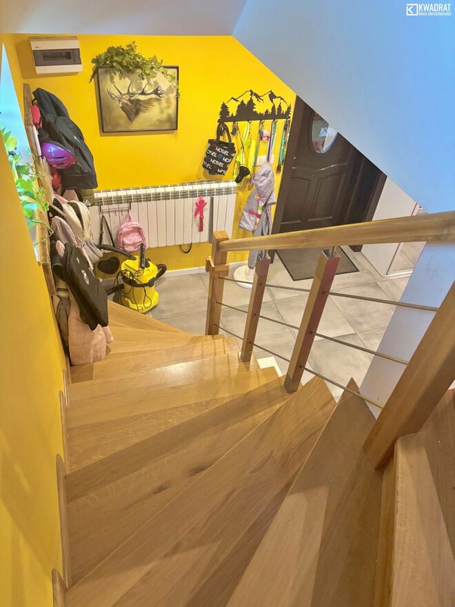 Przeszedł rozbudowę w 2016 roku, wraz z wymianą instalacji i stolarki. Pokryty blachodachówką. Do domu przylega taras. Na parterze znajdziemy kuchnię, duży salon (36 m2), łazienkę z WC i przedpokój. Poddasze to 4 sypialnie, łazienka i garderoba. Dom ogrzewany piecem na drewno i węgiel. Ciepła woda z zasobnika, ogrzewana solarami.