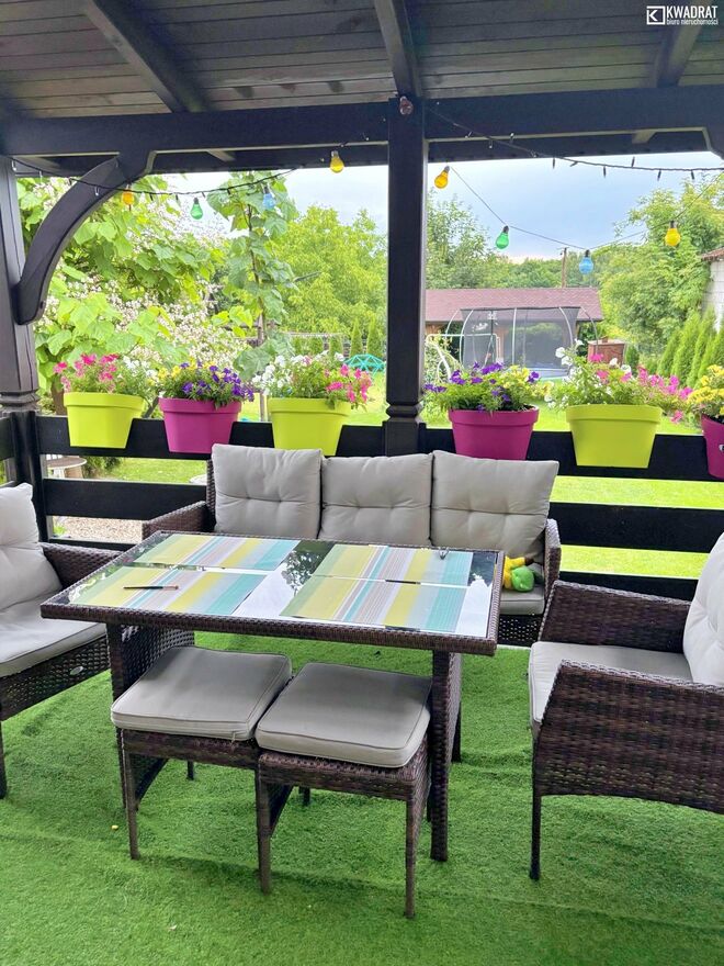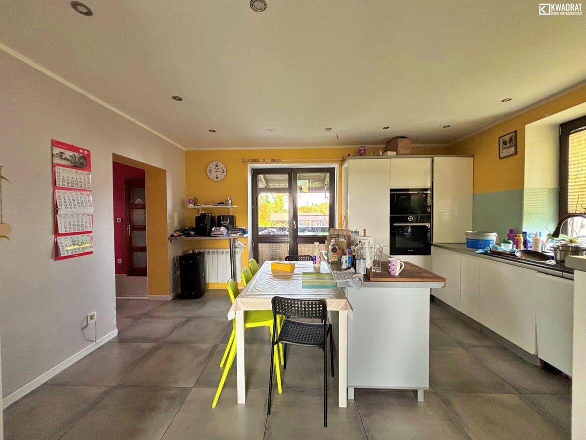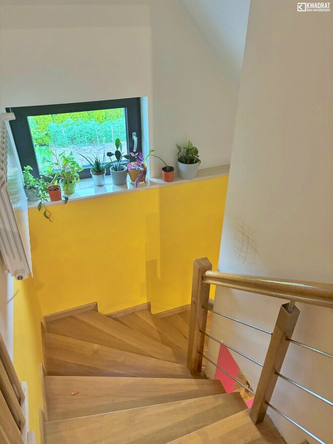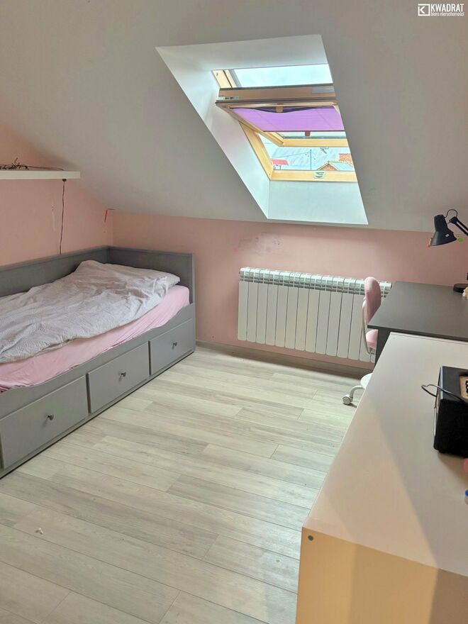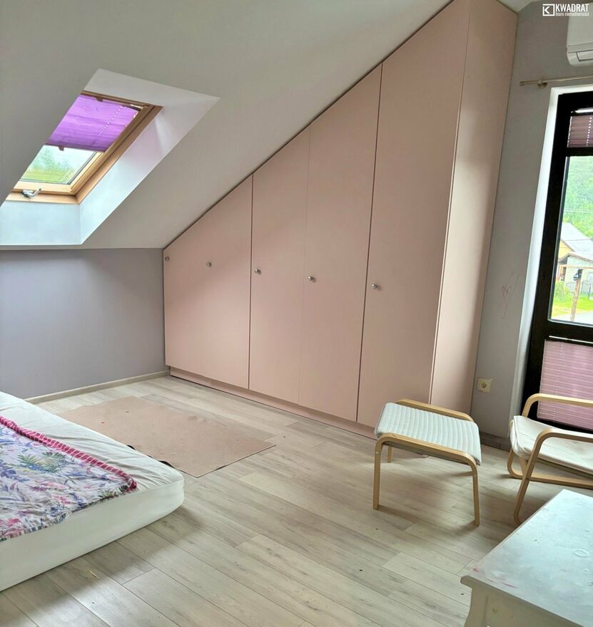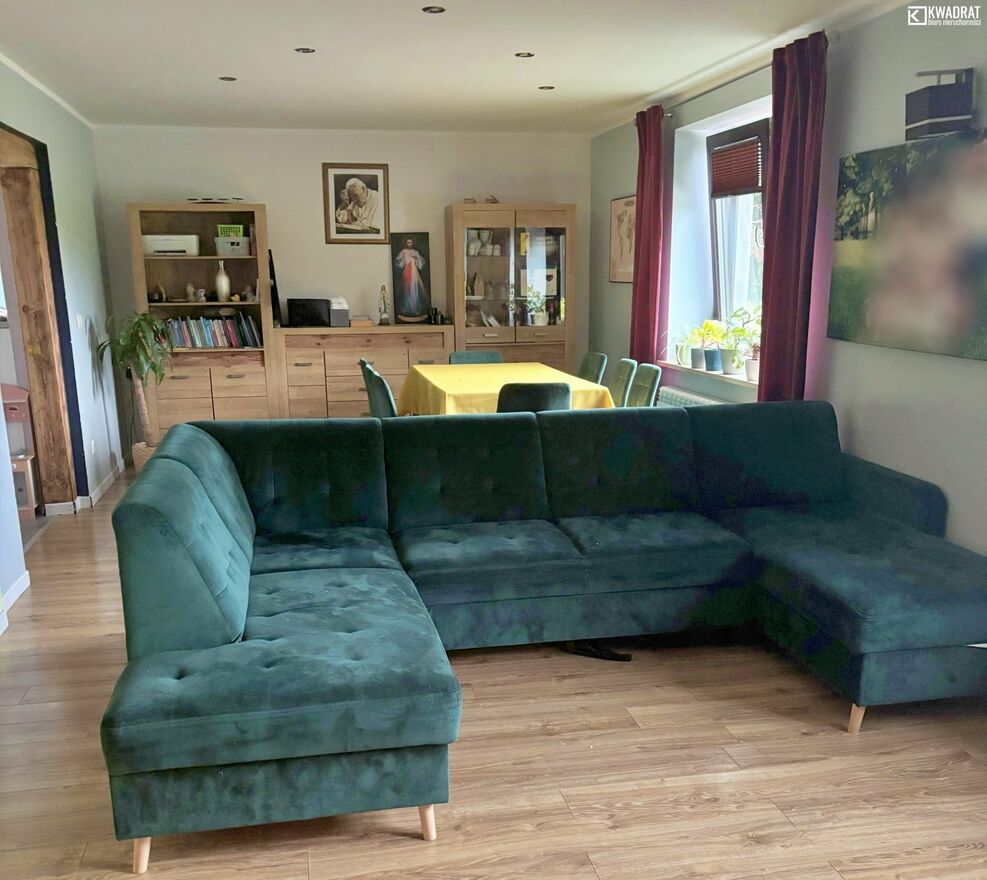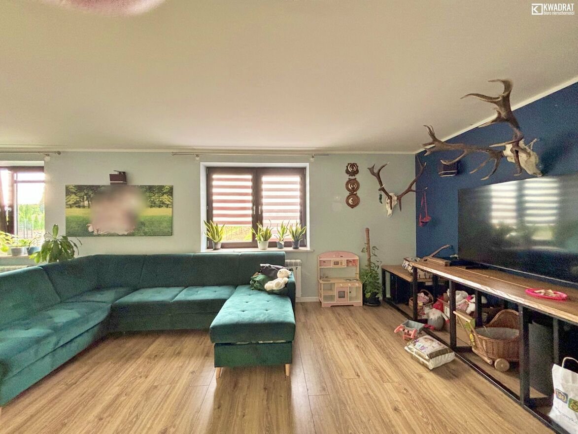 Przeszedł rozbudowę w 2016 roku, wraz z wymianą instalacji i stolarki. Pokryty blachodachówką. Do domu przylega taras. Na parterze znajdziemy kuchnię, duży salon (36 m2), łazienkę z WC i przedpokój. Poddasze to 4 sypialnie, łazienka i garderoba. Dom ogrzewany piecem na drewno i węgiel. Ciepła woda z zasobnika, ogrzewana solarami.
